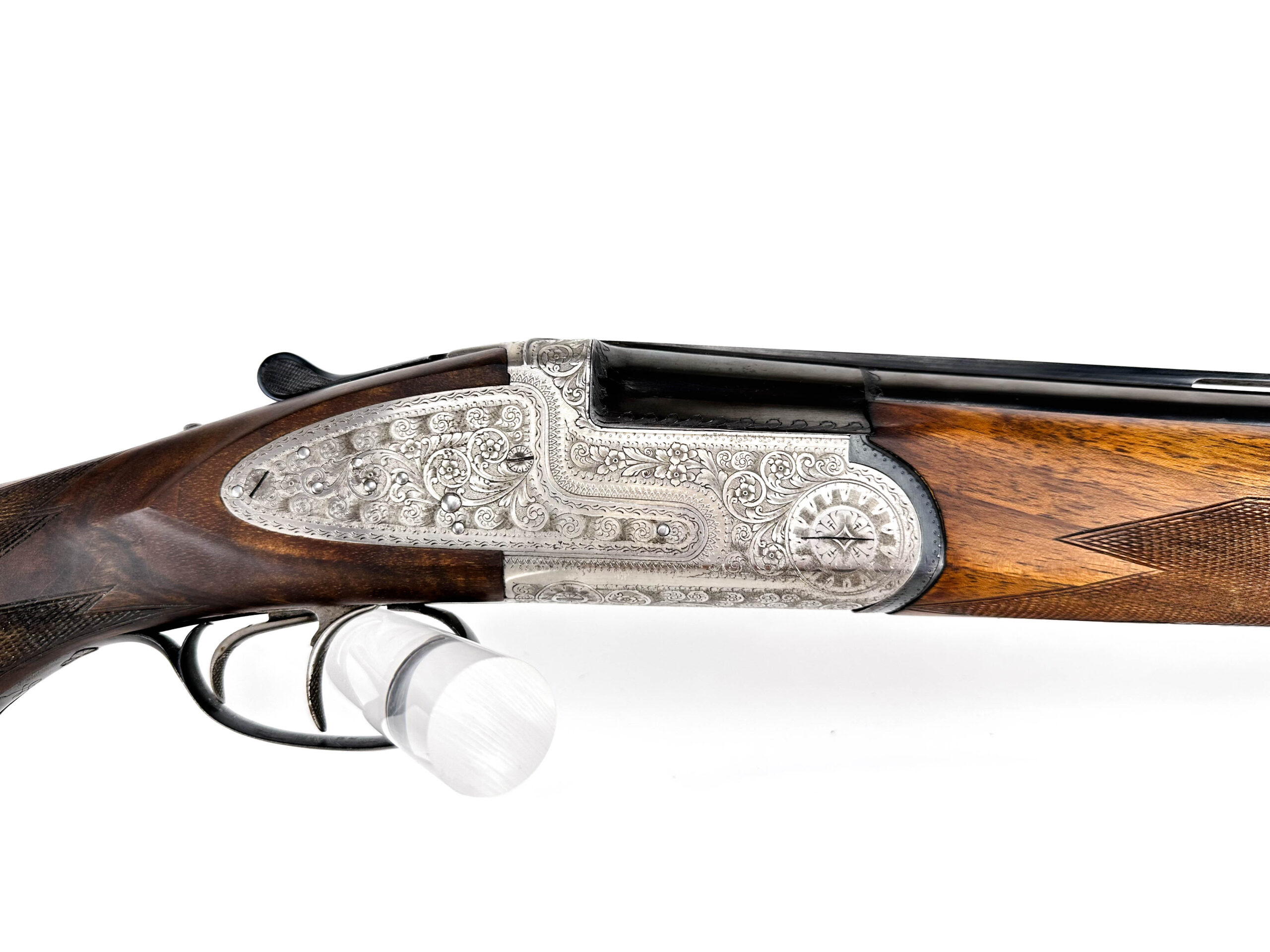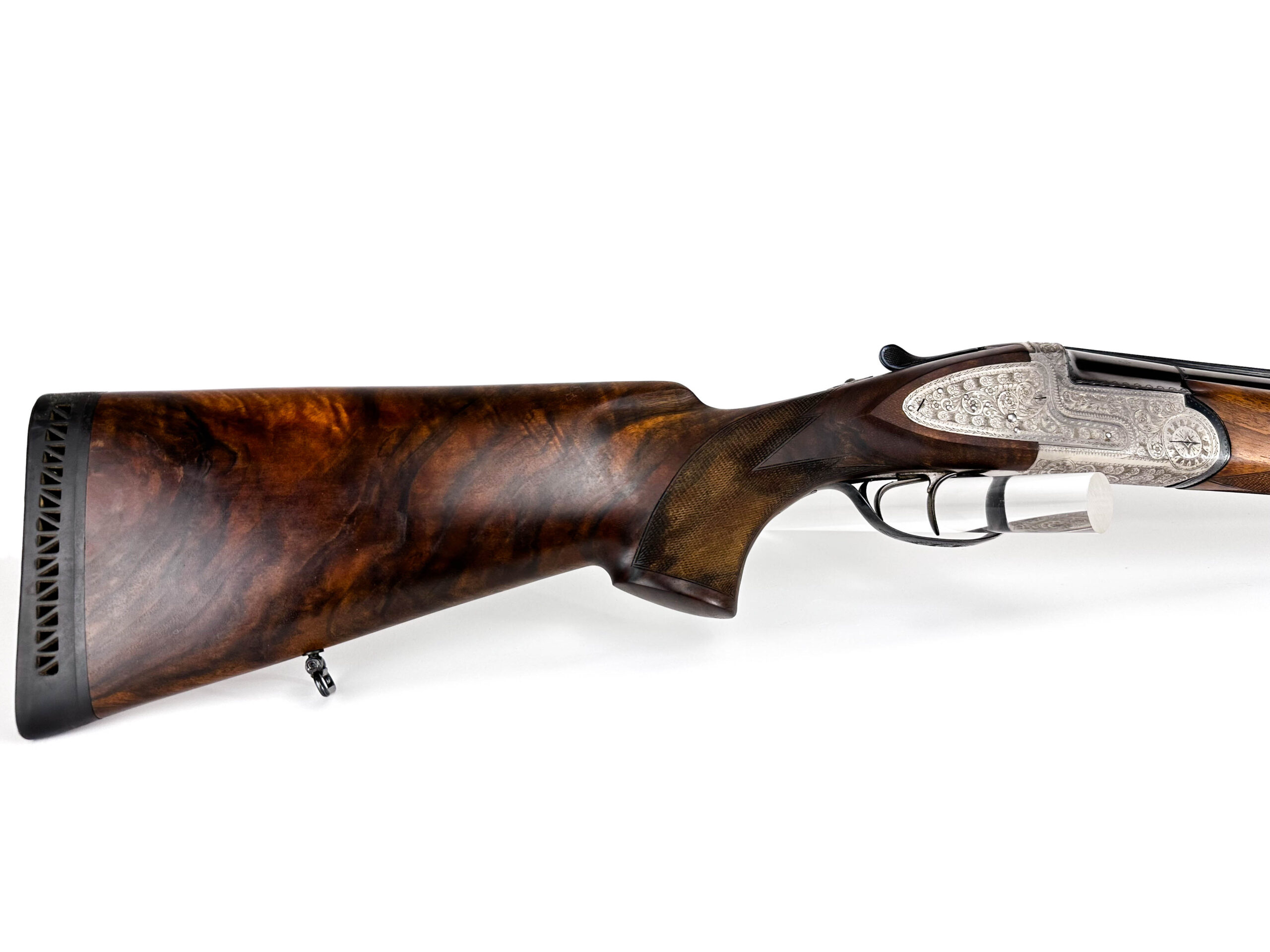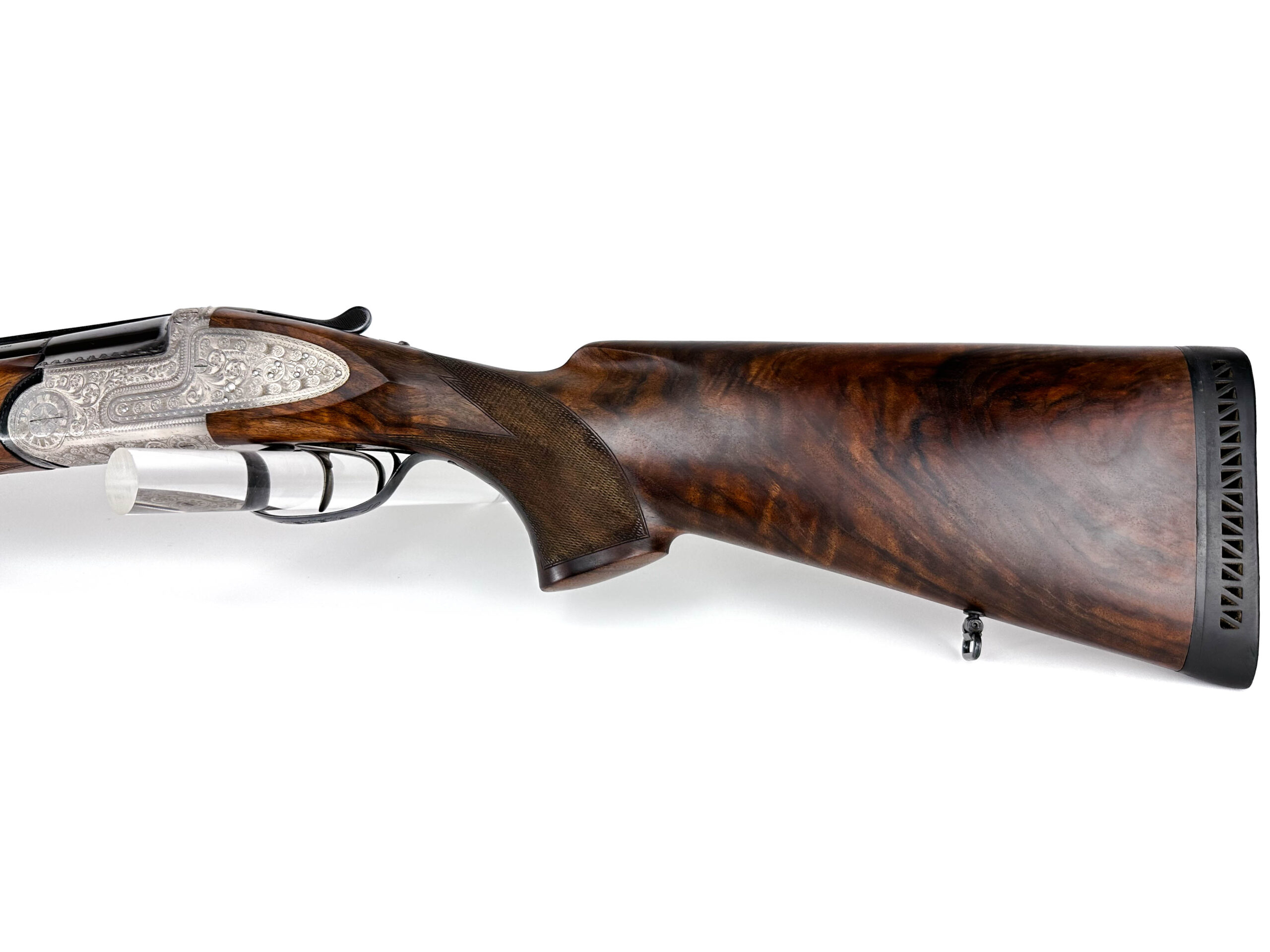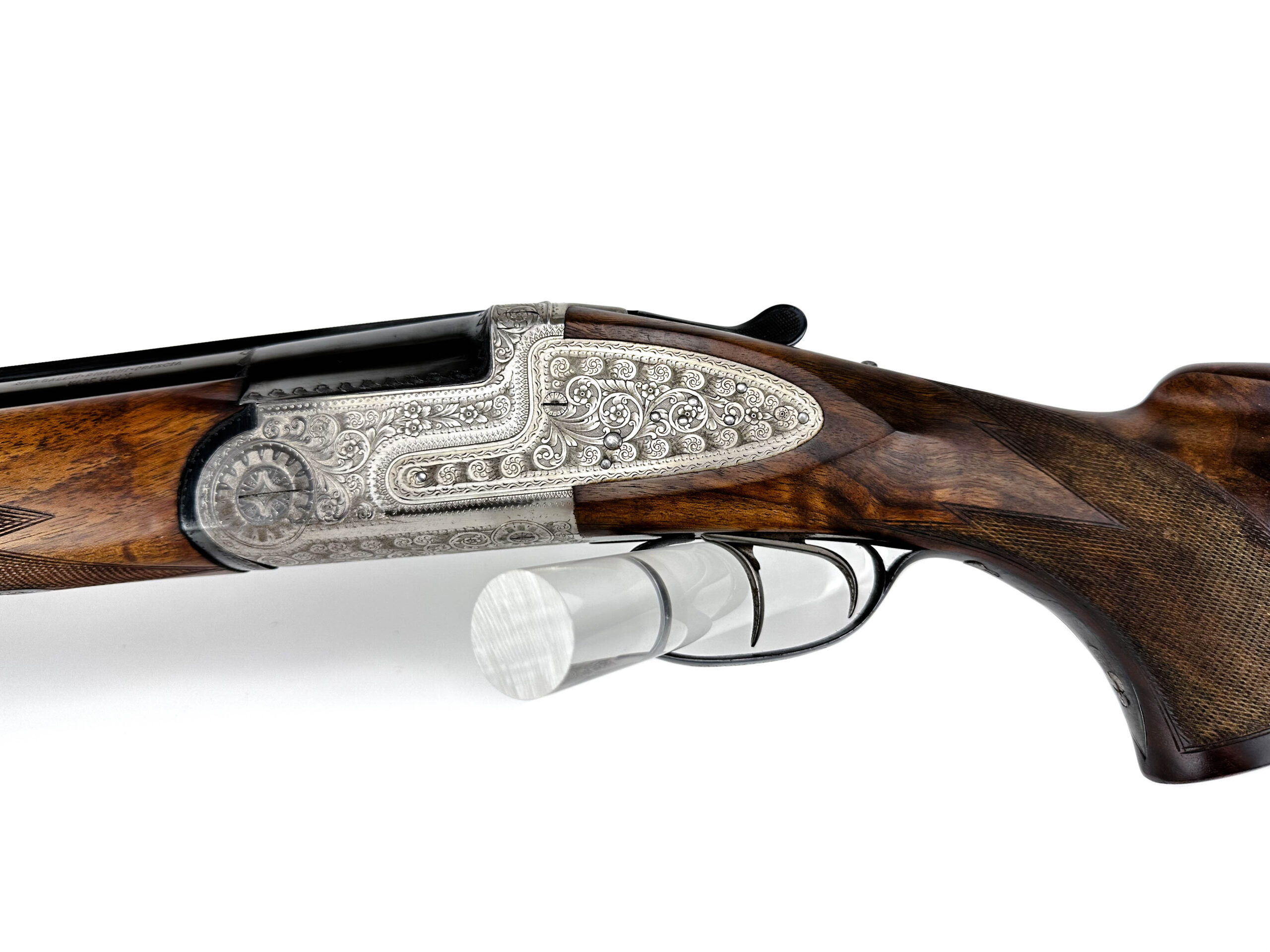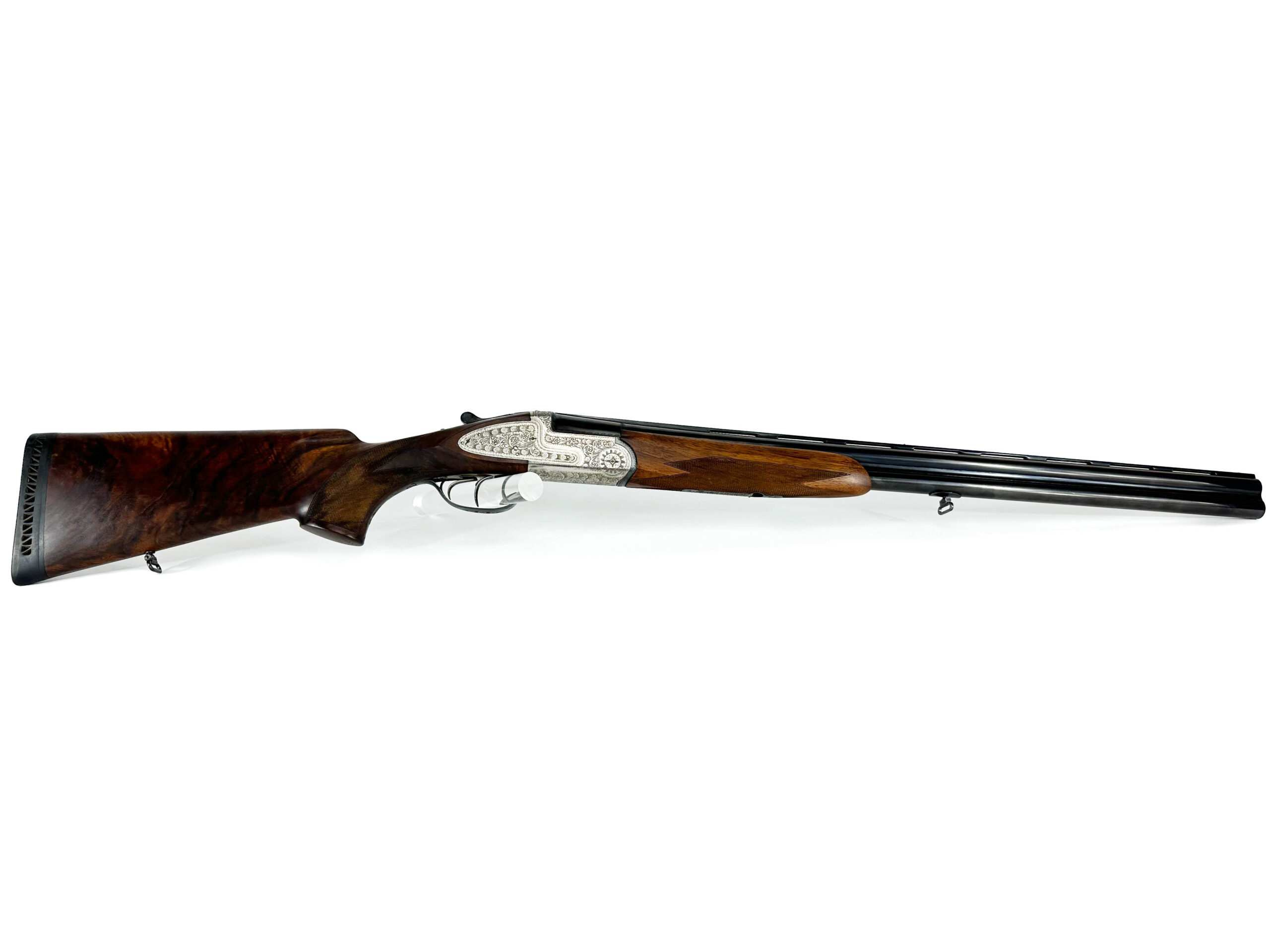 Nabízená broková kozlice Rino Galesi v univerzální ráži 12/70 představuje vrcholnou ukázku italského citu pro detail a eleganci. Jedná se o vyšší provedení osazené automatickými vyhazováky a klasickou loveckou dvouspouští. Na první pohled zbraň zaujme pažbou z výběrové kořenovice s bohatou kresbou, která v kombinaci s dlouhými bočními deskami zdobenými jemnou arabeskou dodává zbrani exkluzivní vzhled. Vývrt je naprosto lesklý a čistý, budící dojem téměř nepoužívané zbraně. Zámky nabízené brokovnice Rino Galesi jsou zcela pevné, bez jakýchkoliv vůlí. Jde o mimořádně zachovalou zbraň, která je díky své estetice a spolehlivosti ideální volbou pro slavnostní lovecké události.