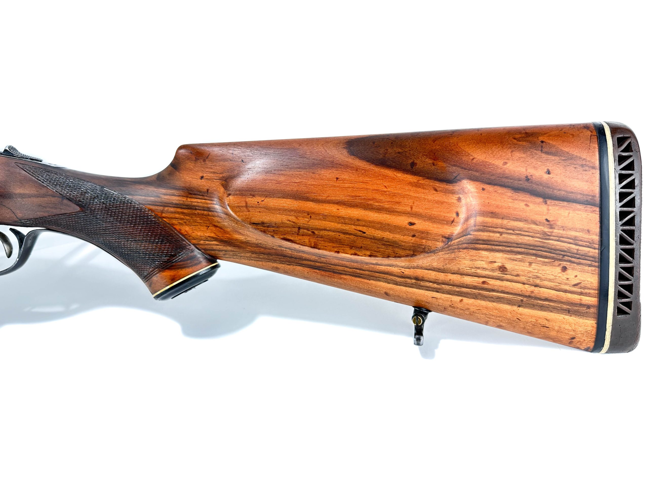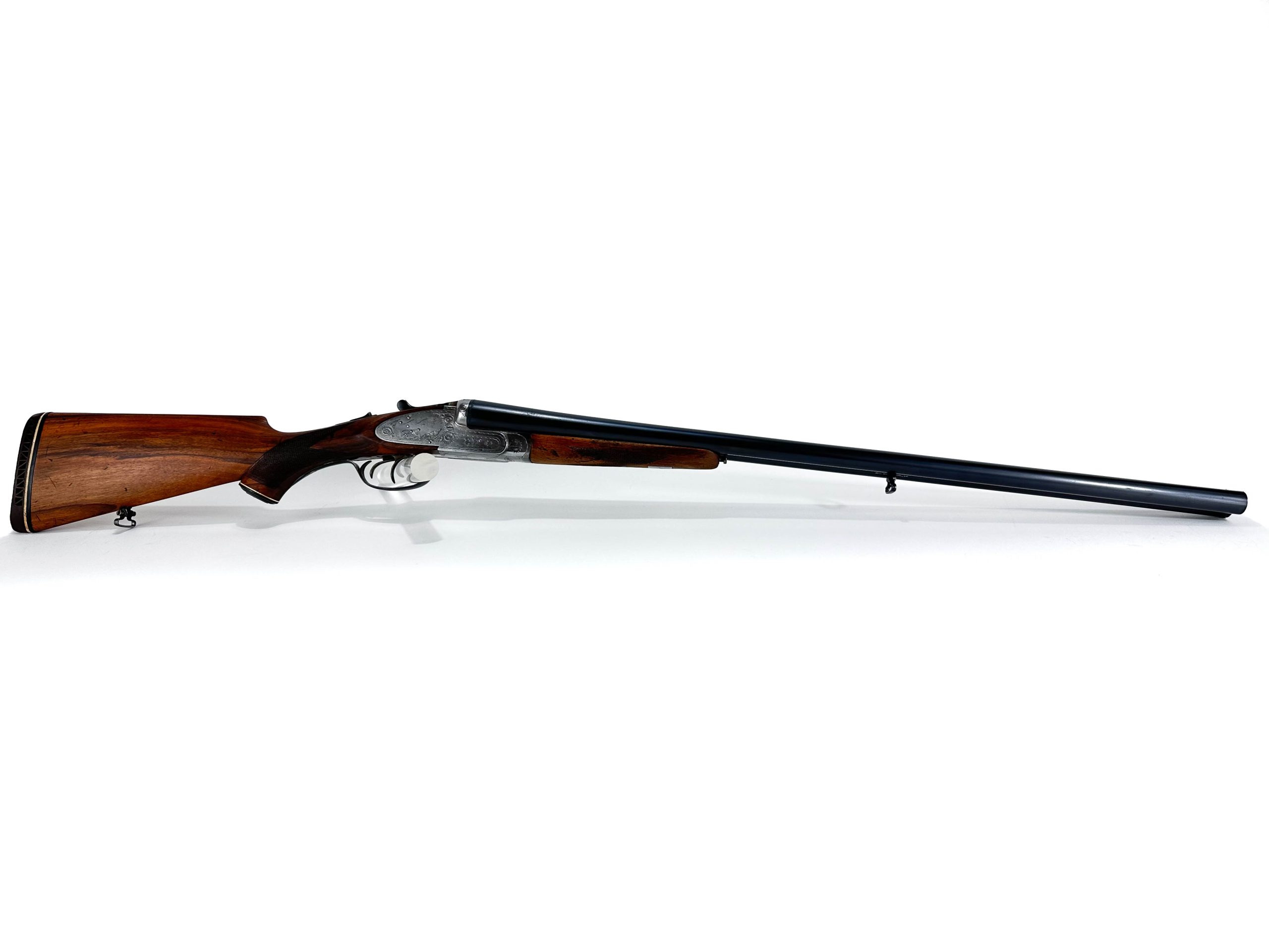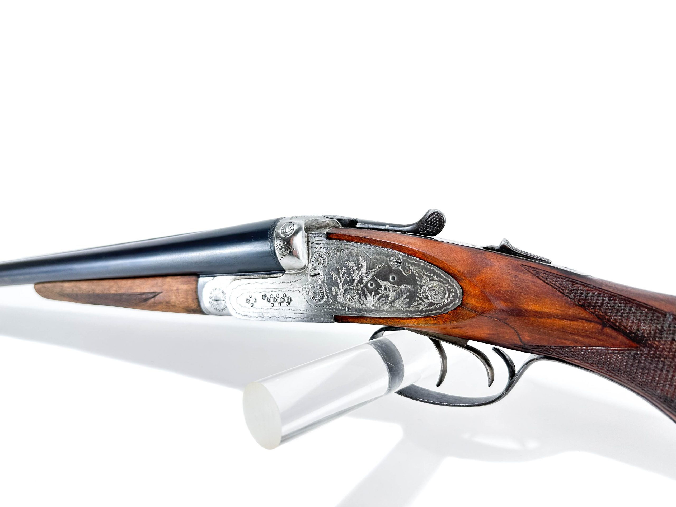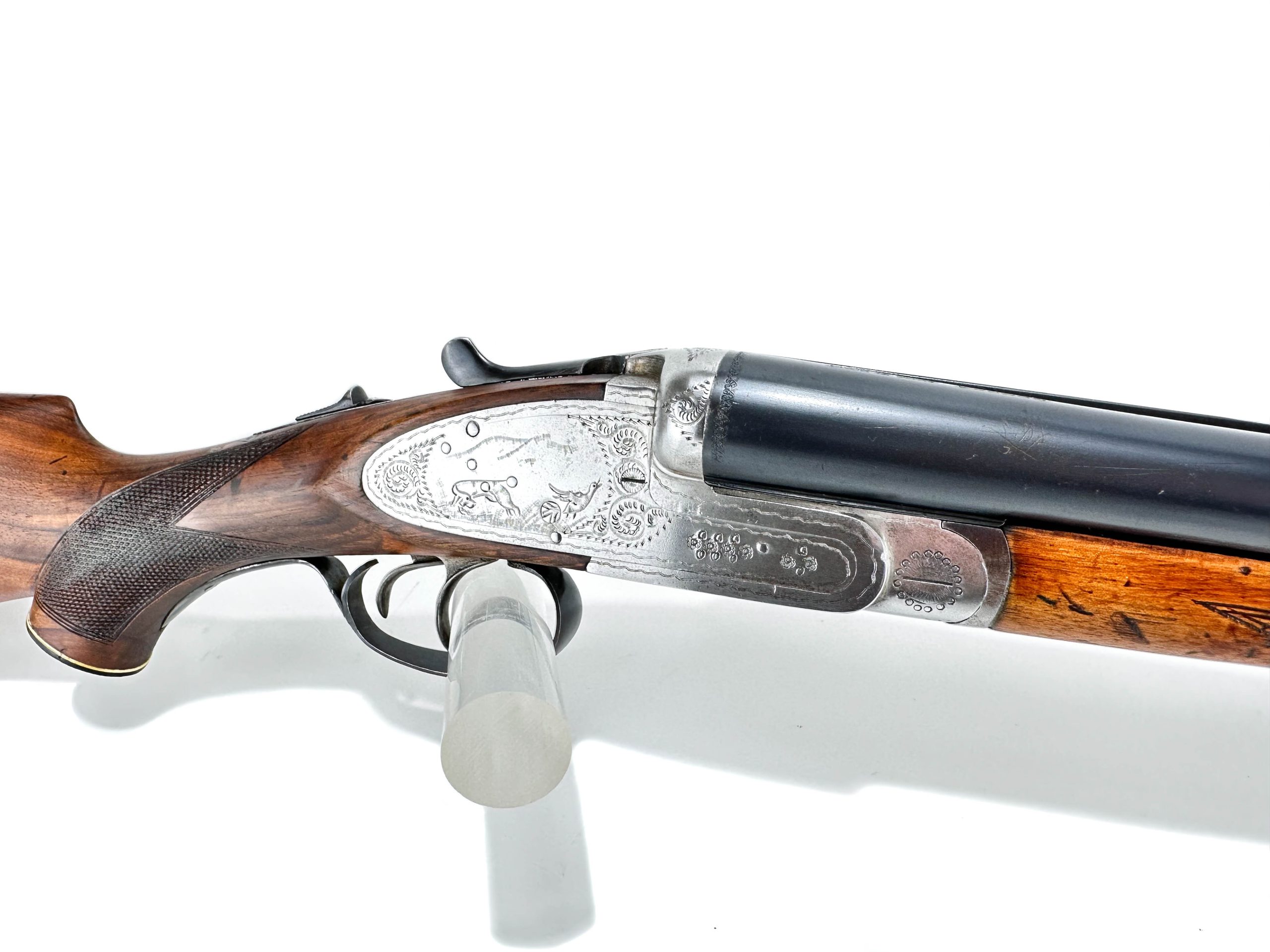 Nabízená broková dvojka Pedro Gorosabel v ráži 12/70, vyrobená roku 1984 v Eibaru, představuje elegantní spojení tradiční baskické školy a vysoké funkční kvality. Brokovnice je vybavena bočními zámky – plnohodnotnými mechanickými komponenty uchycenými na bočních deskách, které jsou nejen technickým znakem vyšší třídy, ale i prvkem estetické hodnoty. Baskule nese jemnou ruční rytinu s loveckým motivem doplněnou arabeskou, která podtrhuje celkovou eleganci zbraně. Zbraň je nabízena v nošeném stavu, přičemž povrchová úprava pažby vykazuje mírné známky používání; mechanické části jsou však ve výborném stavu – zámek je pevný, hlavně čisté a zrcadlové. Tento kus představuje atraktivní volbu jak pro aktivní lovce, tak pro sběratele hledající kvalitní brokovnici s charakterem a příběhem.